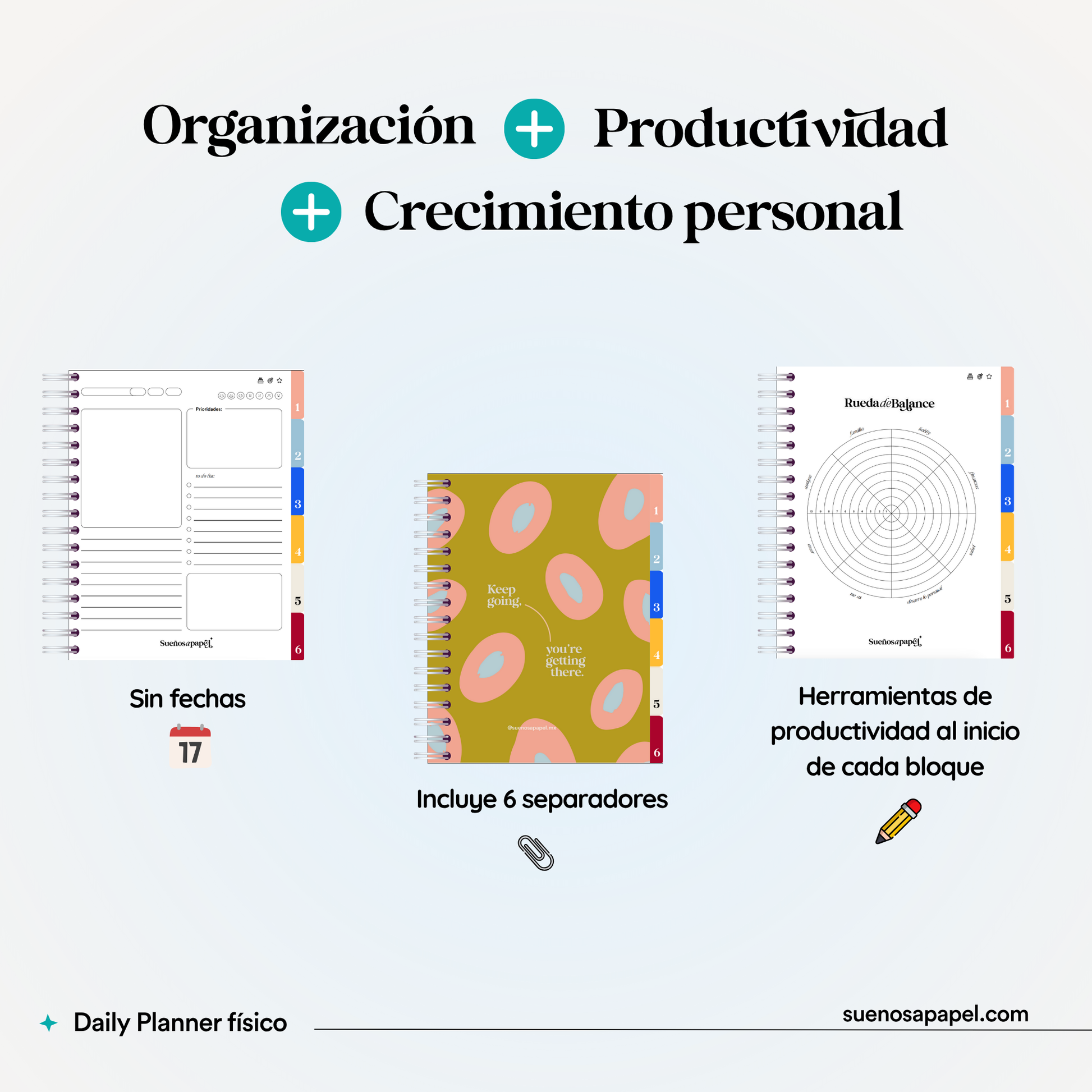 Transforma tu organización diaria con nuestro DAILY PLANNER diseñado SIN FECHAS para ofrecerte la máxima flexibilidad. Ideal para planificar a tu propio ritmo.